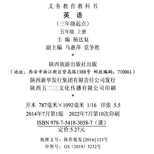 陕旅新版小学英语五年级上册(三年级起点)(适用2022年)