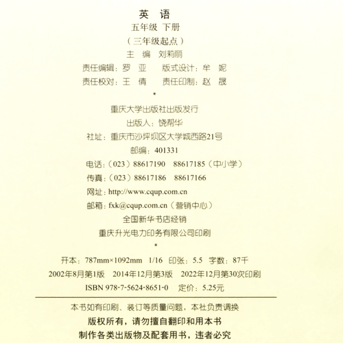 重庆小学英语五年级下册(三年级起点)(适用2023年)
