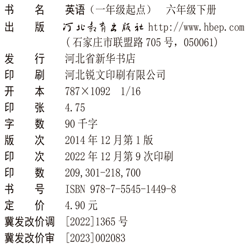 河北小学英语六年级下册(一年级起点)(适用2023年)