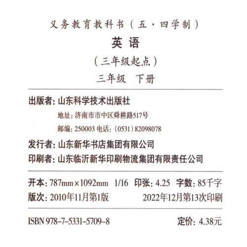 山东科技小学英语三年级下册(三年级起点)(五四学制)(适用2023年)