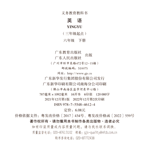 广东小学英语六年级下册(三年级起点)(适用2023年)
