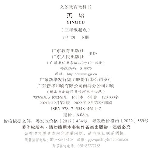 广东小学英语五年级下册(三年级起点)(适用2023年)